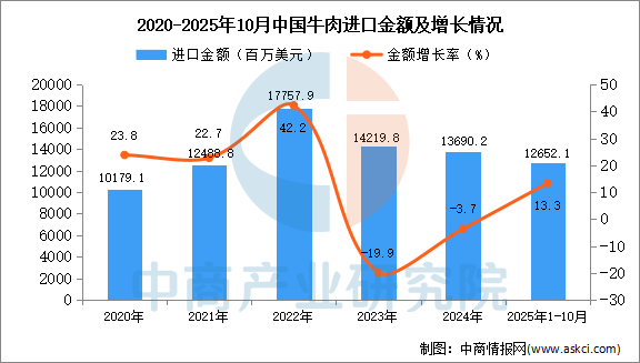 從金額方面來看,數(shù)據(jù)顯示,2025年1-10月中國牛肉進口金額12652.1百萬美元,同比增長13.3%。