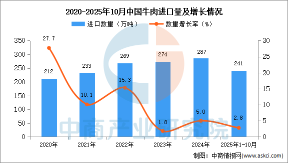 中商情報網(wǎng)訊:據(jù)中商產(chǎn)業(yè)研究院數(shù)據(jù)庫顯示,2024年中國牛肉進口量287萬噸,同比增長5.0%。最新數(shù)據(jù)顯示,2025年1-10月中國牛肉進口量241萬噸,同比增長2.8%。