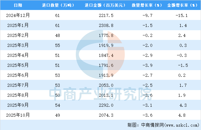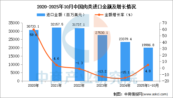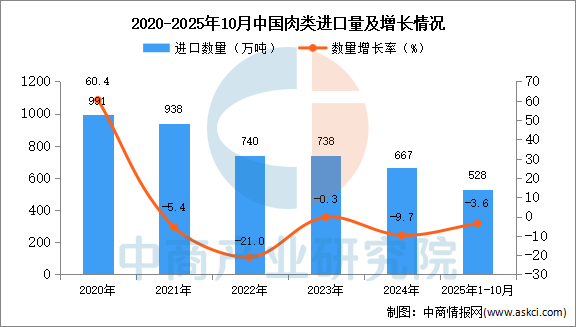 2025年10月中國肉類(包括雜碎)進口量及金額增長情況