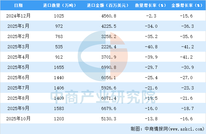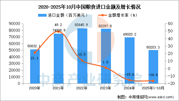 從金額方面來看,數(shù)據(jù)顯示,2025年1-10月中國糧食進口金額50203.3百萬美元,同比下降16.6%。