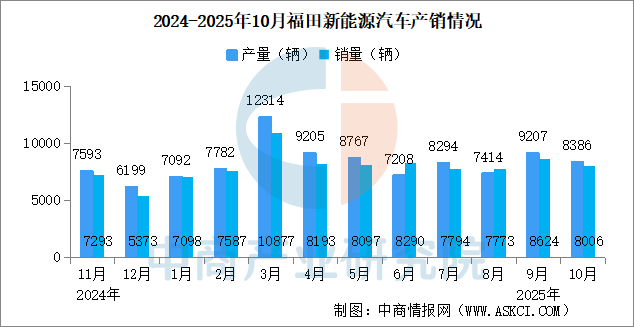2025年10月,福田新能源汽車產(chǎn)量8386輛,同比增長31.77%。銷量8006輛,同比增長21.82%。2025年1-10月,福田新能源汽車產(chǎn)量8.57萬輛,同比增長99.25%。累計銷量8.23萬輛,同比增長98.83%。