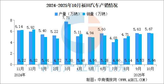 中商情報網(wǎng)訊:2025年10月,福田汽車產(chǎn)量5.67萬輛,同比增長6.47%。銷量5.66萬輛,同比增長1.01%。2025年1-10月,福田汽車產(chǎn)量54.00萬輛,同比增長10.10%。累計銷量53.67萬輛,同比增長9.80%。