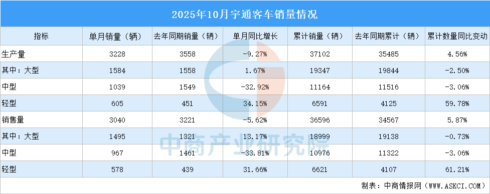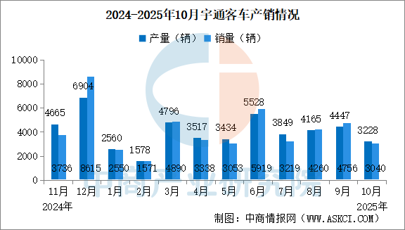 中商情報網(wǎng)訊:2025年10月,宇通客車產(chǎn)量3228輛,同比減少9.27%。2025年1-10月,宇通客車?yán)塾嫯a(chǎn)量37102萬輛,同比增長4.56%。