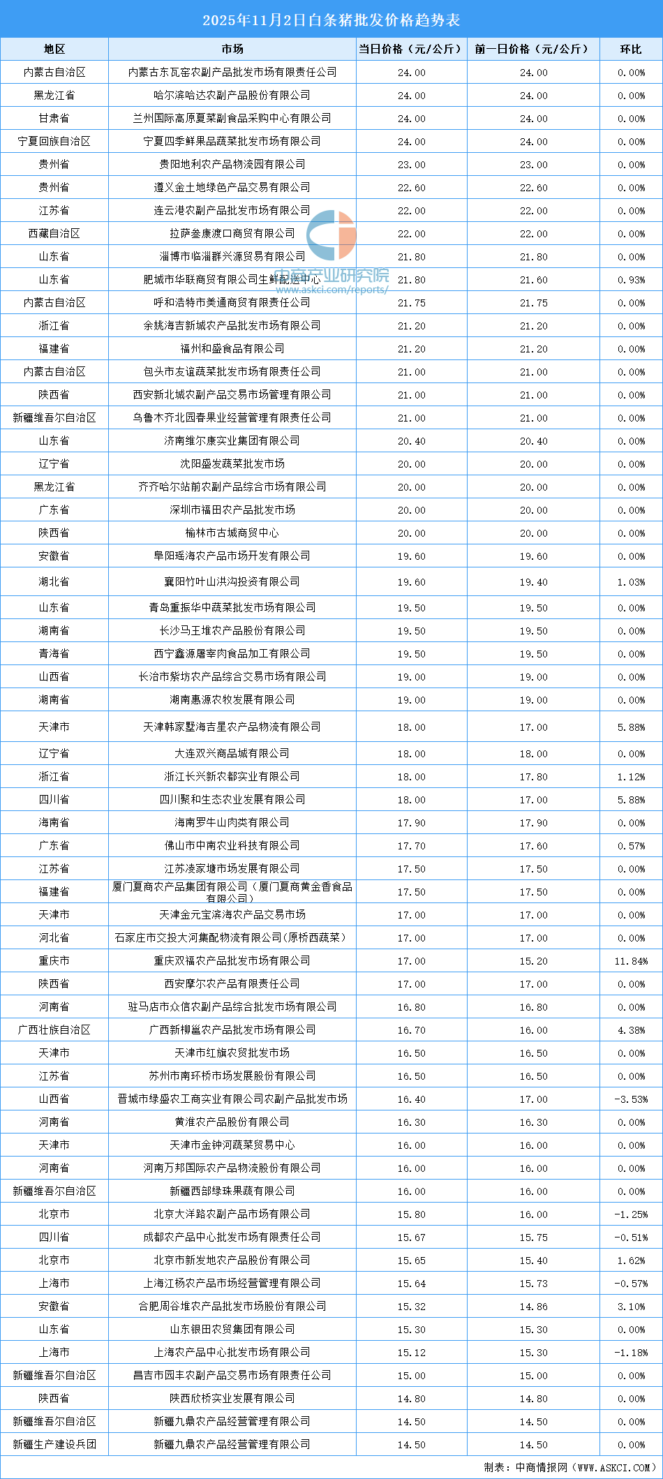 中商情報(bào)網(wǎng)訊:最新數(shù)據(jù)顯示:11月2日全國白條豬平均價(jià)格為18.63元/公斤。其中,白條豬價(jià)格最高的市場是內(nèi)蒙古東瓦窯農(nóng)副產(chǎn)品批發(fā)市場有限責(zé)任公司、哈爾濱哈達(dá)農(nóng)副產(chǎn)品股份有限公司、蘭州國際高原夏菜副食品采購中心有限公司、寧夏四季鮮果品蔬菜批發(fā)市場有限公司,當(dāng)日價(jià)格均為24.00元/公斤。白條豬價(jià)格最低的是新疆九鼎農(nóng)產(chǎn)品經(jīng)營管理有限公司,當(dāng)日價(jià)格為14.50元/公斤,環(huán)比持平。