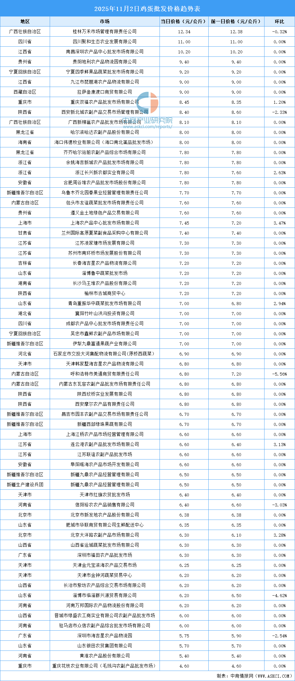中商情報網(wǎng)訊:最新數(shù)據(jù)顯示:11月2日全國雞蛋平均價格為7.20元/公斤。其中,雞蛋價格最高的市場是桂林萬禾市場管理有限責(zé)任公司,當(dāng)日價格為12.34元/公斤,環(huán)比下跌0.32%。雞蛋價格最低的市場是重慶花枝農(nóng)業(yè)有限公司(毛線溝農(nóng)副產(chǎn)品批發(fā)市場),當(dāng)日價格為4.60元/公斤,環(huán)比持平。