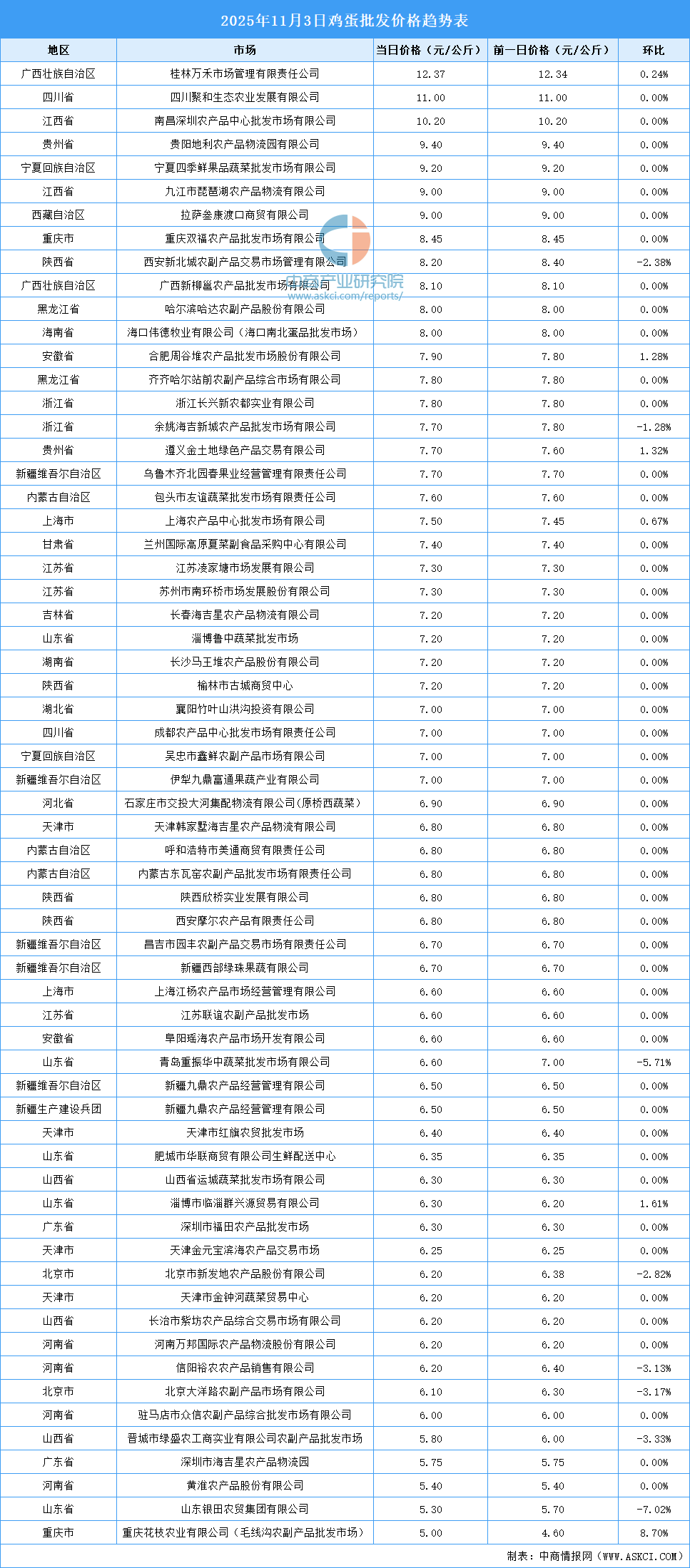 中商情報(bào)網(wǎng)訊:最新數(shù)據(jù)顯示:11月3日全國雞蛋平均價格為7.20元/公斤。其中,雞蛋價格最高的市場是桂林萬禾市場管理有限責(zé)任公司,當(dāng)日價格為12.37元/公斤,環(huán)比上漲0.24%。雞蛋價格最低的市場是重慶花枝農(nóng)業(yè)有限公司(毛線溝農(nóng)副產(chǎn)品批發(fā)市場),當(dāng)日價格為5.00元/公斤,環(huán)比上漲8.70%。
