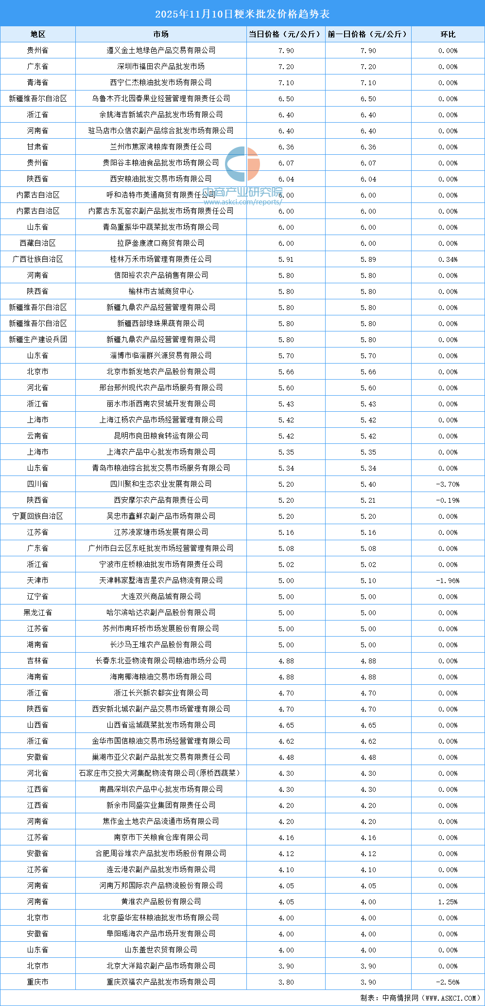 中商情報網(wǎng)訊:最新數(shù)據(jù)顯示:11月10日,全國粳米當日均價為5.23元/公斤,秈米當日均價4.91元/公斤。其中,粳米價格最高的遵義金土地綠色產(chǎn)品交易有限公司,當日價格為7.90元/公斤,環(huán)比持平。秈米價格最高的市場是拉薩叁康渡口商貿(mào)有限公司,當日價格為8.00元/公斤,環(huán)比持平。以下是2025年11月10日全國大米價格趨勢表詳情: