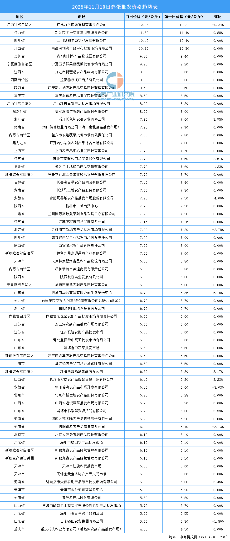 中商情報(bào)網(wǎng)訊:最新數(shù)據(jù)顯示:11月10日全國(guó)雞蛋平均價(jià)格為7.18元/公斤。其中,雞蛋價(jià)格最高的市場(chǎng)是桂林萬(wàn)禾市場(chǎng)管理有限責(zé)任公司,當(dāng)日價(jià)格為12.24元/公斤,環(huán)比下跌0.24%。雞蛋價(jià)格最低的市場(chǎng)是重慶花枝農(nóng)業(yè)有限公司(毛線溝農(nóng)副產(chǎn)品批發(fā)市場(chǎng)),當(dāng)日價(jià)格為4.50元/公斤,環(huán)比持平。