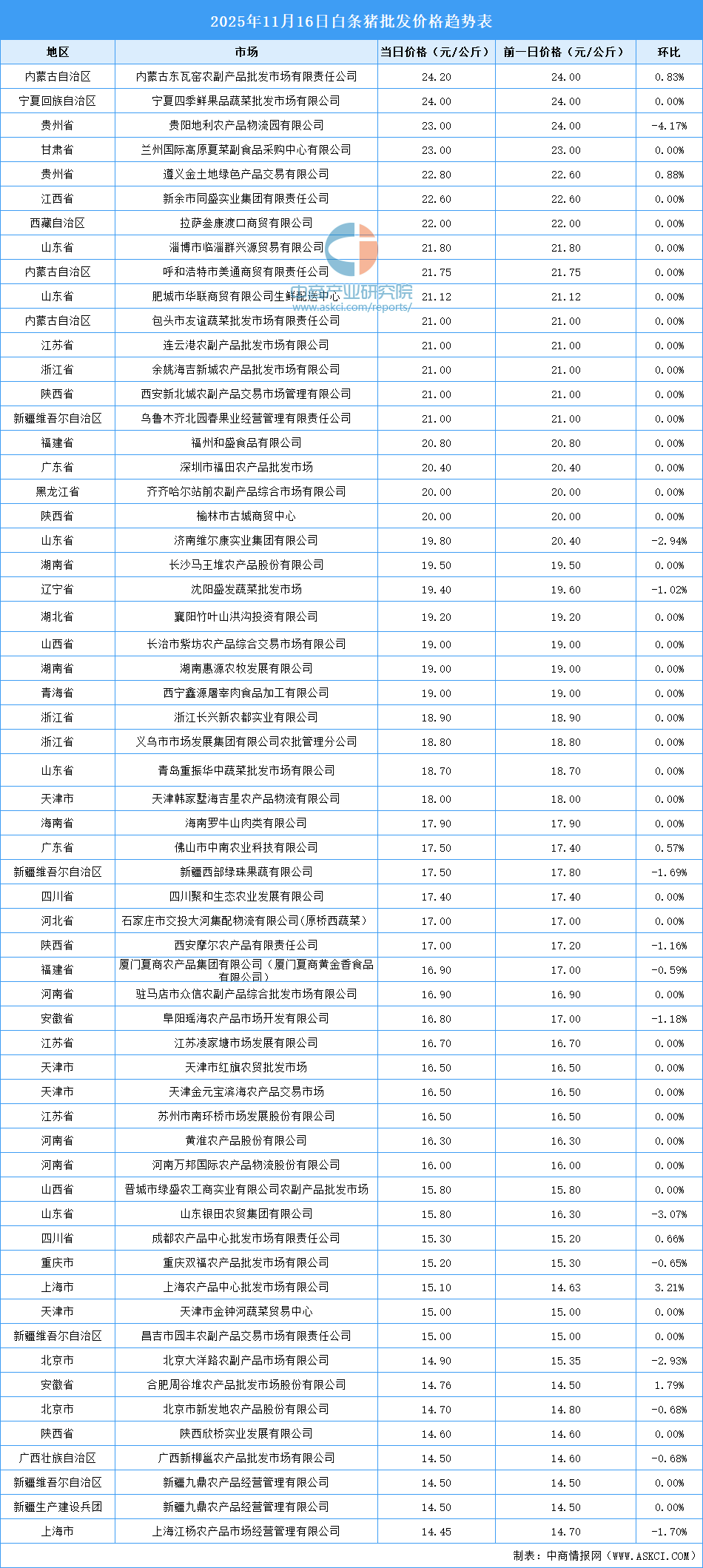 中商情報網訊:最新數(shù)據顯示:11月16日全國白條豬平均價格為18.32元/公斤。其中,白條豬價格最高的市場是內蒙古東瓦窯農副產品批發(fā)市場有限責任公司,當日價格為24.20元/公斤,環(huán)比上漲0.83%。白條豬價格最低的是上海江楊農產品市場經營管理有限公司,當日價格為14.45元/公斤,環(huán)比下跌1.70%。