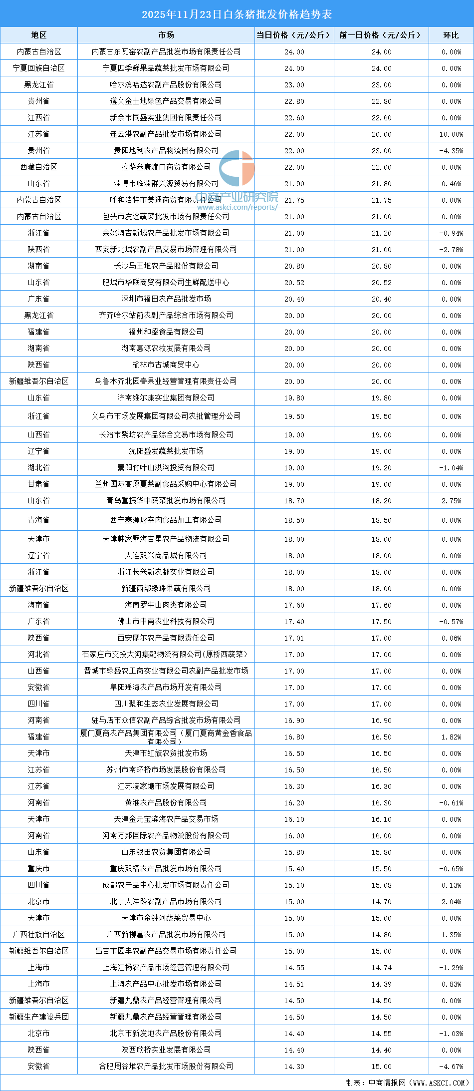 2025年11月24日全國(guó)各地最新白條豬價(jià)格行情走勢(shì)分析