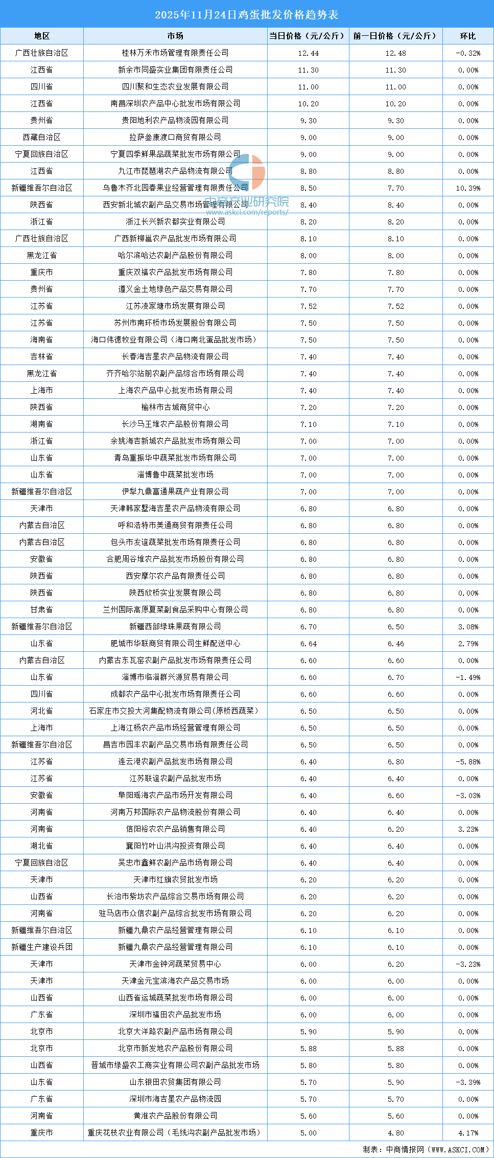 中商情報(bào)網(wǎng)訊:最新數(shù)據(jù)顯示:11月24日全國(guó)雞蛋平均價(jià)格為7.14元/公斤。其中,雞蛋價(jià)格最高的市場(chǎng)是桂林萬(wàn)禾市場(chǎng)管理有限責(zé)任公司,當(dāng)日價(jià)格為12.44元/公斤,環(huán)比下跌0.32%。雞蛋價(jià)格最低的市場(chǎng)是重慶花枝農(nóng)業(yè)有限公司(毛線溝農(nóng)副產(chǎn)品批發(fā)市場(chǎng)),當(dāng)日價(jià)格為5.00元/公斤,環(huán)比上漲4.17%。
