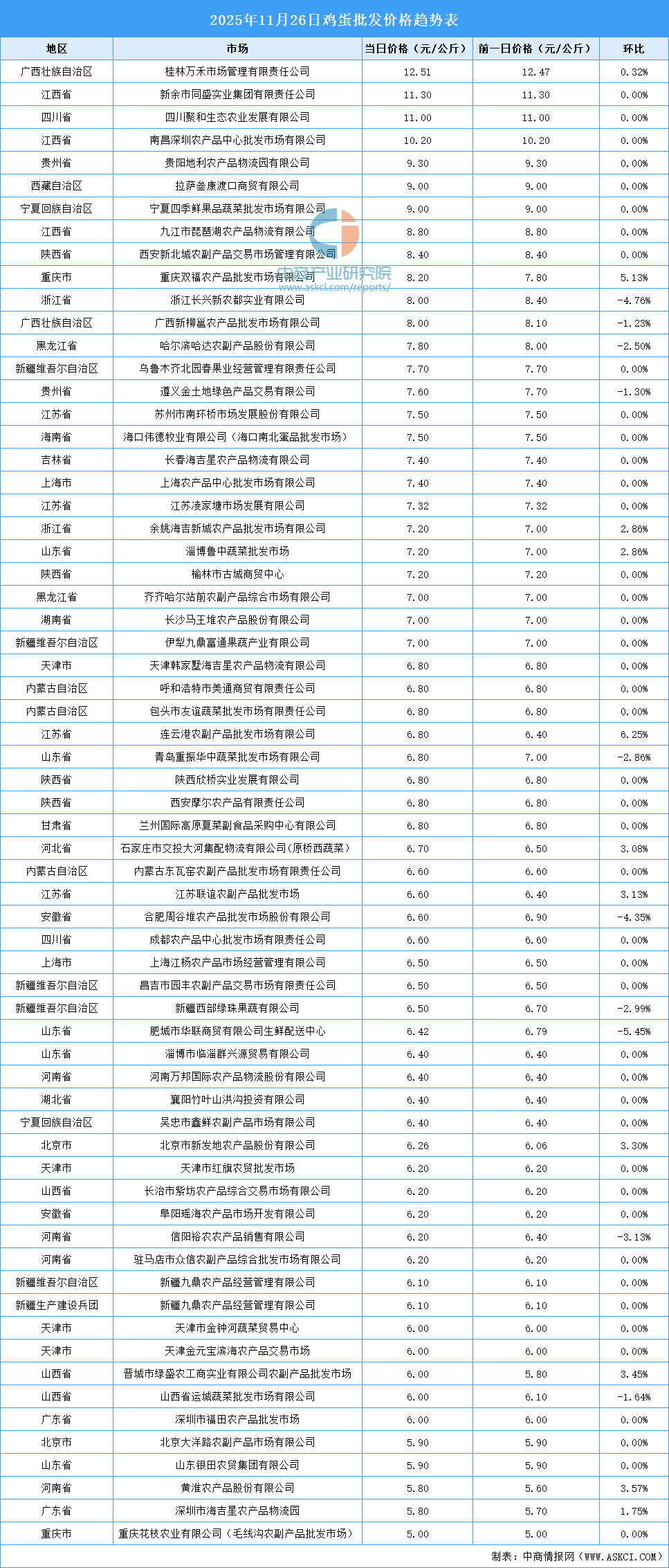 中商情報(bào)網(wǎng)訊:最新數(shù)據(jù)顯示:11月26日全國(guó)雞蛋平均價(jià)格為7.13元/公斤。其中,雞蛋價(jià)格最高的市場(chǎng)是桂林萬(wàn)禾市場(chǎng)管理有限責(zé)任公司,當(dāng)日價(jià)格為12.51元/公斤,環(huán)比上漲0.32%。雞蛋價(jià)格最低的市場(chǎng)是重慶花枝農(nóng)業(yè)有限公司(毛線(xiàn)溝農(nóng)副產(chǎn)品批發(fā)市場(chǎng)),當(dāng)日價(jià)格為5.00元/公斤,環(huán)比持平。